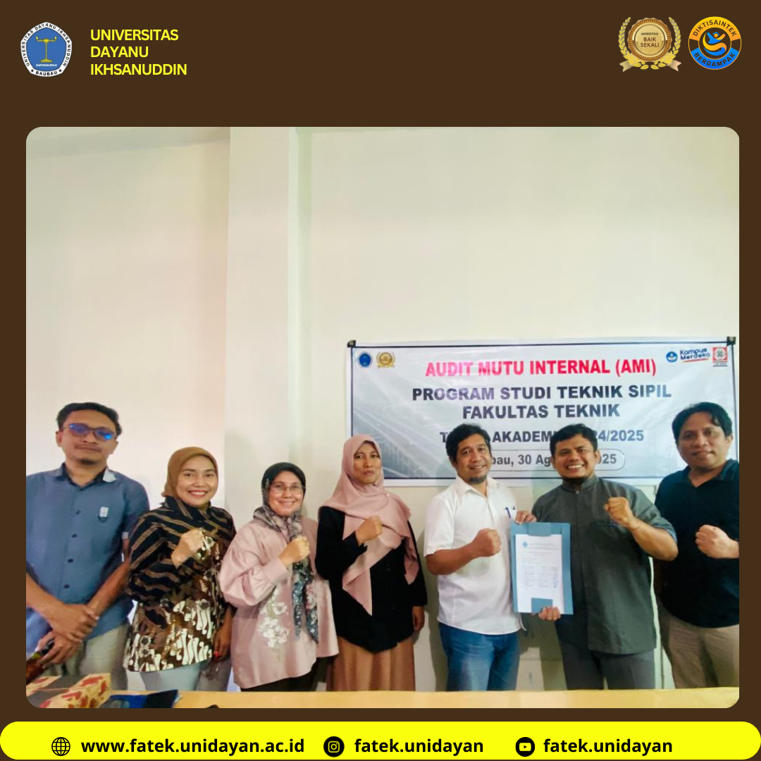 Program Studi Teknik Sipil Fakultas Teknik Universitas Dayanu Ikhsanuddin kembali menunjukkan komitmen kuat dalam menjaga serta meningkatkan kualitas pendidikan dengan melaksanakan kegiatan Audit Mutu Internal (AMI) Tahun Akademik 2024/2025. Audit ini merupakan langkah penting yang tidak hanya berfungsi sebagai kewajiban administratif, tetapi juga menjadi wujud nyata keseriusan sivitas akademika dalam menjawab tantangan global serta memastikan tata kelola pendidikan yang bermutu, transparan, dan akuntabel. Melalui kegiatan ini, berbagai aspek penting seperti kurikulum, proses pembelajaran, sarana dan prasarana, hingga capaian pembelajaran mahasiswa dievaluasi secara menyeluruh guna menjamin kesesuaian dengan standar nasional pendidikan tinggi.