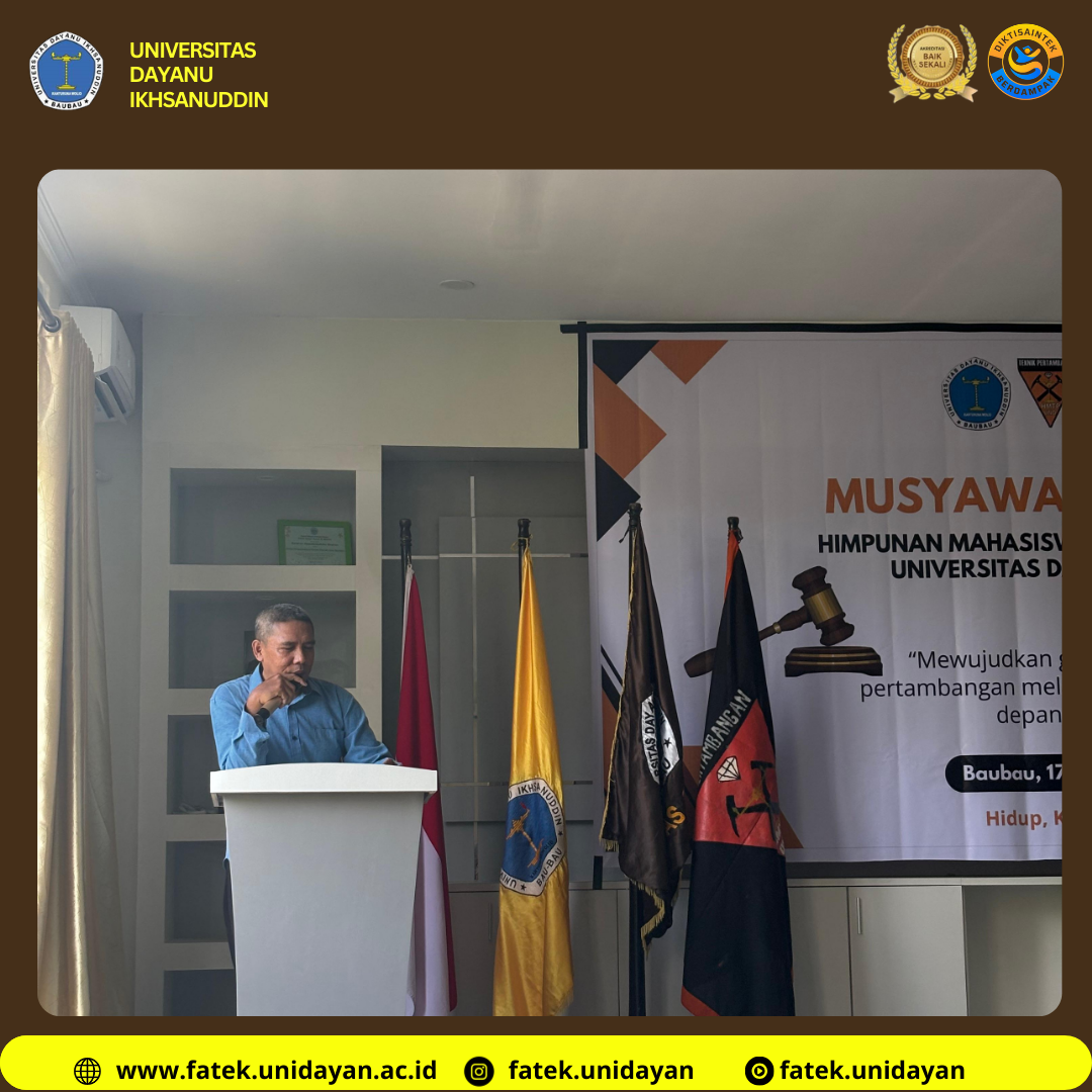 Dekan Fakultas Teknik, Ir. Hilda Sulaiman Nur, S.T., M.T., juga memberikan sambutan yang penuh motivasi dan harapan. Beliau mengingatkan bahwa masa depan dunia pertambangan saat ini bergerak ke arah teknologi modern yang mengedepankan keberlanjutan. Oleh karena itu, mahasiswa dituntut untuk menjadi insan pertambangan yang adaptif dan inovatif. “Tema MUBES ke VI sangat relevan dengan tuntutan global. Keberlanjutan bukan hanya slogan, tetapi prinsip yang harus kita terapkan dalam setiap langkah. Kami percaya HMTP akan terus menjadi wadah pembentukan karakter dan profesionalisme mahasiswa Teknik Pertambangan UNIDAYAN,” tegasnya.