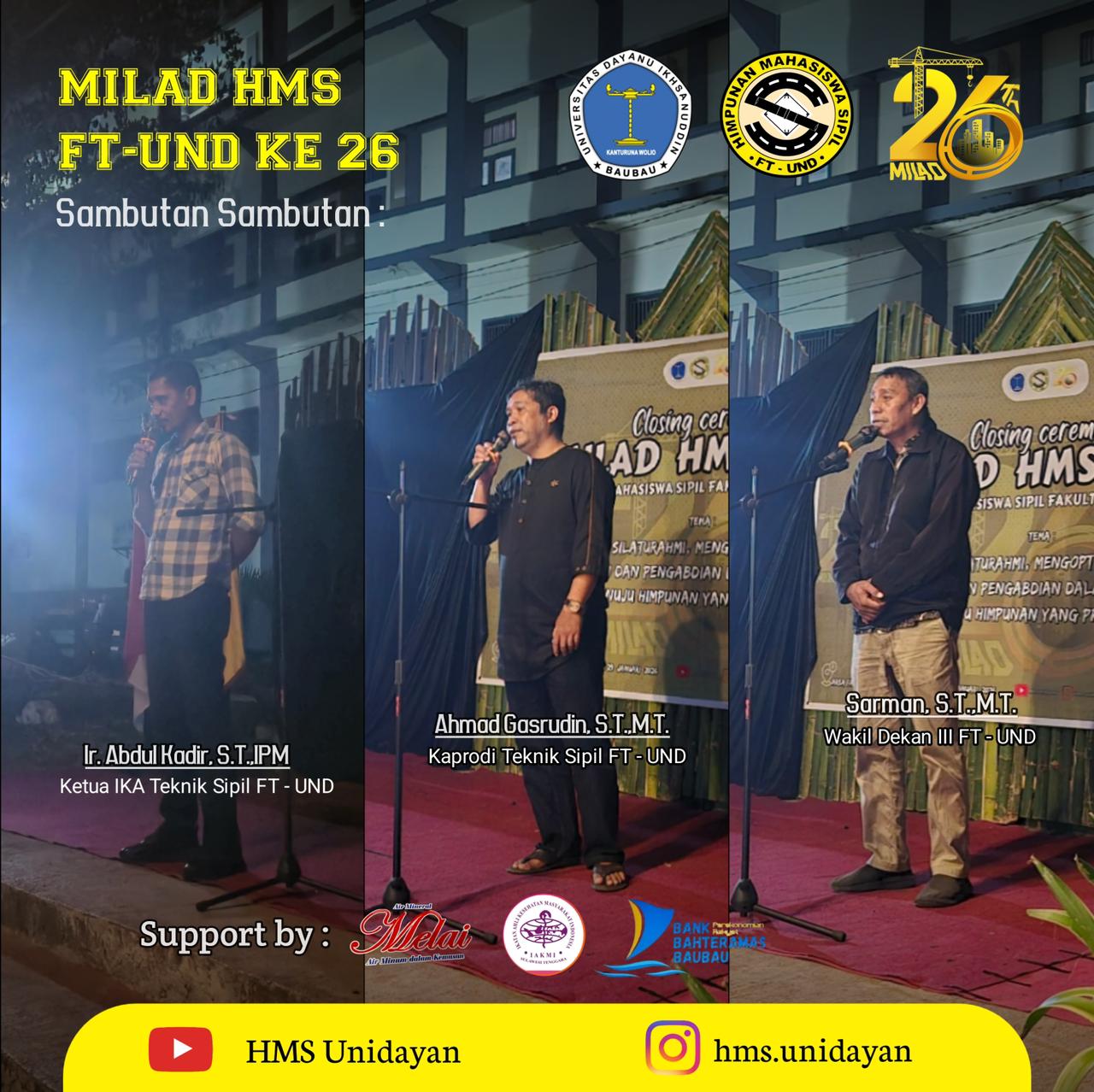 Dalam sambutannya, Wakil Dekan III Fakultas Teknik Universitas Dayanu Ikhsanuddin Sarman, S.T.,M.T., menyampaikan apresiasi atas terselenggaranya kegiatan Milad ke-26 HMS FT-Unidayan. Ia menilai bahwa peringatan milad ini bukan hanya menjadi ajang seremonial, tetapi juga wadah pembinaan karakter, kepemimpinan, serta penguatan peran mahasiswa sebagai agen perubahan di tengah masyarakat.