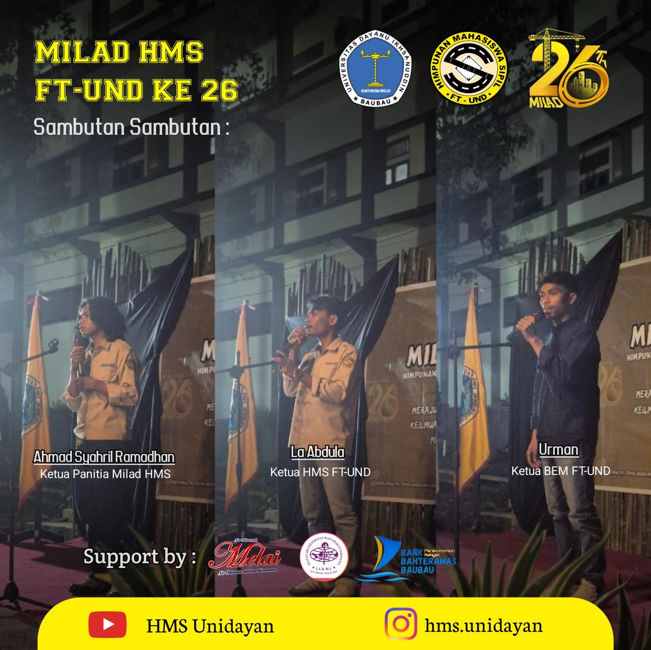 Selain itu, Ketua Umum HMS FT-Unidayan La Abdullah, menyampaikan rasa syukur atas perjalanan organisasi yang telah mencapai usia ke-26 tahun. ia menyampaikan apresiasi dan dukungan atas terselenggaranya peringatan Milad ke-26 HMS FT-Unidayan yang dirangkaikan dengan kegiatan edukatif bagi pelajar SMA/SMK se-Sultra.