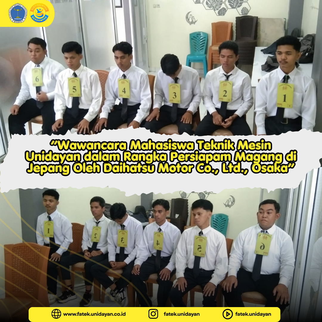 Sebagai bagian dari rangkaian persiapan program tersebut, mahasiswa Program Studi Teknik Mesin Fakultas Teknik Universitas Dayanu Ikhsanuddin mengikuti proses seleksi untuk program magang industri di perusahaan otomotif Jepang, yaitu Daihatsu Motor Co., Ltd. yang berlokasi di Osaka, Japan. Tahapan seleksi ini dilaksanakan pada hari Kamis dan diikuti oleh sejumlah mahasiswa yang telah melalui proses administrasi sebelumnya. Para peserta mengikuti tahapan seleksi dengan penuh keseriusan dan mengenakan pakaian formal sebagai bentuk kesiapan serta profesionalisme dalam mengikuti proses rekrutmen internasional. Setiap peserta juga menggunakan nomor urut sebagai identitas selama proses seleksi berlangsung guna memudahkan pihak penilai dalam melakukan proses evaluasi terhadap masing-masing peserta.