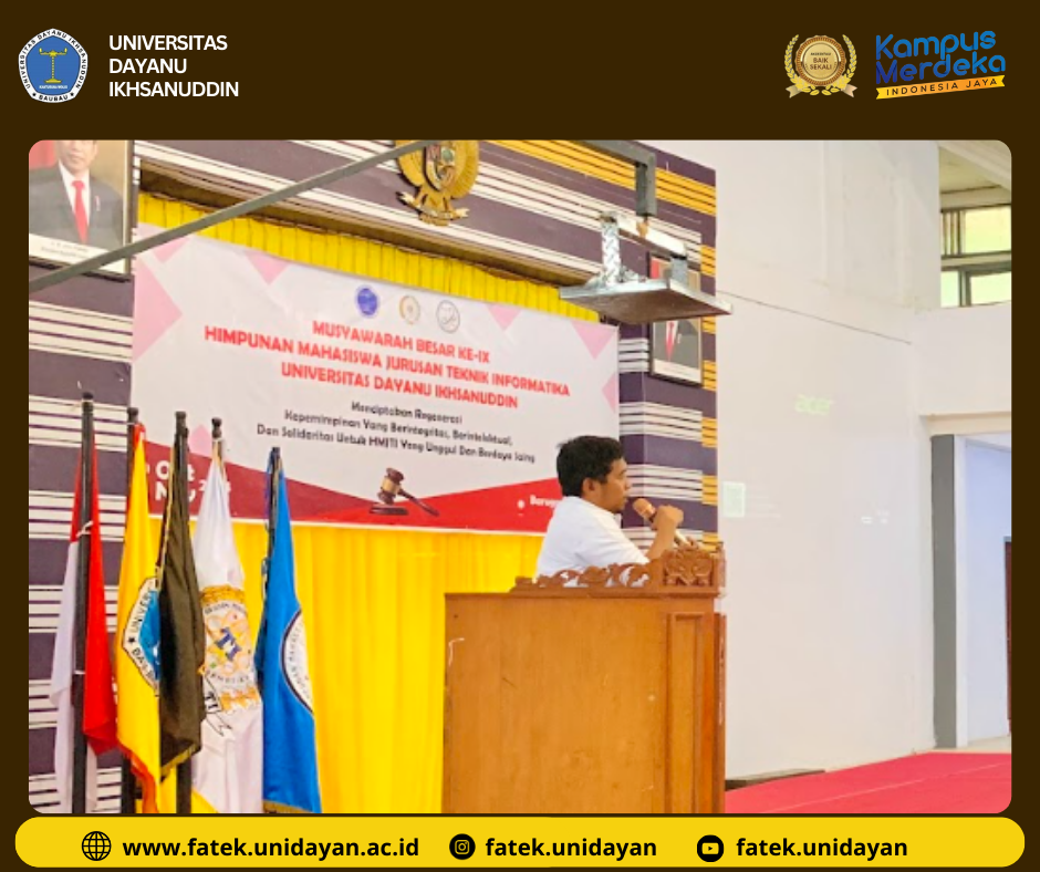 Pada Musyawarah Besar (Mubes) ke-IX Himpunan Mahasiswa Teknik Informatika (HMTI) Universitas Dayanu Ikhsanuddin (Unidayan), Dekan Fakultas Teknik, Bapak Hilda Sulaiman Nut, S.T., M.T., dan Kaprodi Teknik Informatika, Bapak Ery Muchyar Hasiri, S.Kom., M.T., memberikan sambutan yang penuh inspirasi dan motivasi. Dalam sambutannya, Ibu Hilda menekankan pentingnya pembentukan karakter yang kuat serta integritas yang tinggi sebagai pondasi utama dalam regenerasi kepemimpinan. Beliau mengapresiasi semangat mahasiswa Teknik Informatika yang tidak hanya fokus pada pencapaian akademis tetapi juga turut aktif dalam kegiatan organisasi, yang menurutnya menjadi bekal penting bagi mahasiswa untuk menghadapi tantangan di masa depan. Ibu Hilda juga berharap bahwa Mubes ini mampu menjadi wadah pembelajaran yang bernilai tinggi bagi para mahasiswa, khususnya dalam proses pengambilan keputusan secara demokratis dan berlandaskan musyawarah.