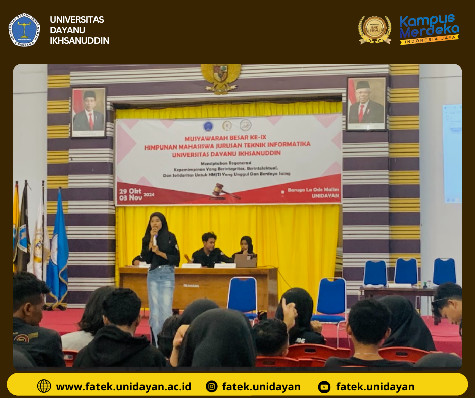 Mahasiswa Teknik Informatika Universitas Dayanu Ikhsanuddin (Unidayan) sukses melaksanakan Musyawarah Besar (Mubes) ke-IX dengan mengusung tema "Menciptakan Regenerasi Kepemimpinan yang Berintegritas, Berintelektual, dan Solidaritas untuk HMTI yang Unggul dan Berdaya Saing". Acara ini berlangsung dengan lancar dan penuh antusiasme, menggambarkan semangat dan tekad mahasiswa dalam memperkuat organisasi Himpunan Mahasiswa Teknik Informatika (HMTI) untuk terus maju dan berkembang. Kegiatan ini dihadiri oleh berbagai tokoh penting dari Fakultas Teknik, termasuk Dekan Fakultas Teknik, Ibu Hilda Sulaiman Nut, S.T., M.T., yang dalam sambutannya menyampaikan apresiasi dan dorongan kepada para mahasiswa untuk terus menjunjung tinggi nilai-nilai integritas serta memperkaya kemampuan intelektual mereka. Selain itu, Kaprodi Teknik Informatika, Bapak Ery Muchyar Hasiri, S.Kom., M.T., juga turut hadir dan memberikan pandangan serta pesan kepada para peserta Mubes. Beliau menekankan pentingnya semangat solidaritas dalam membangun kepengurusan yang tangguh serta pentingnya menumbuhkan daya saing dalam menghadapi era digital yang penuh tantangan.