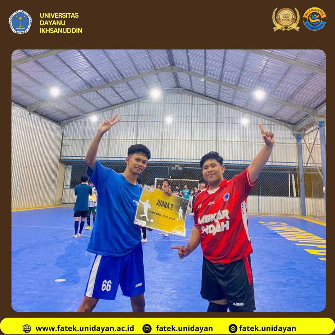 Baubau — Prestasi membanggakan kembali diraih oleh mahasiswa Fakultas Teknik Universitas Dayanu Ikhsanuddin (UNIDAYAN) setelah berhasil mengamankan posisi Juara 2 pada Turnamen Futsal HIMATRIL Cup se-Sulawesi Tenggara. Kompetisi ini berlangsung pada 8–9 November 2025, bertempat di Lapangan Futsal Syafaat, Kendari, dan diikuti oleh berbagai perguruan tinggi teknik dari seluruh wilayah Sulawesi Tenggara.