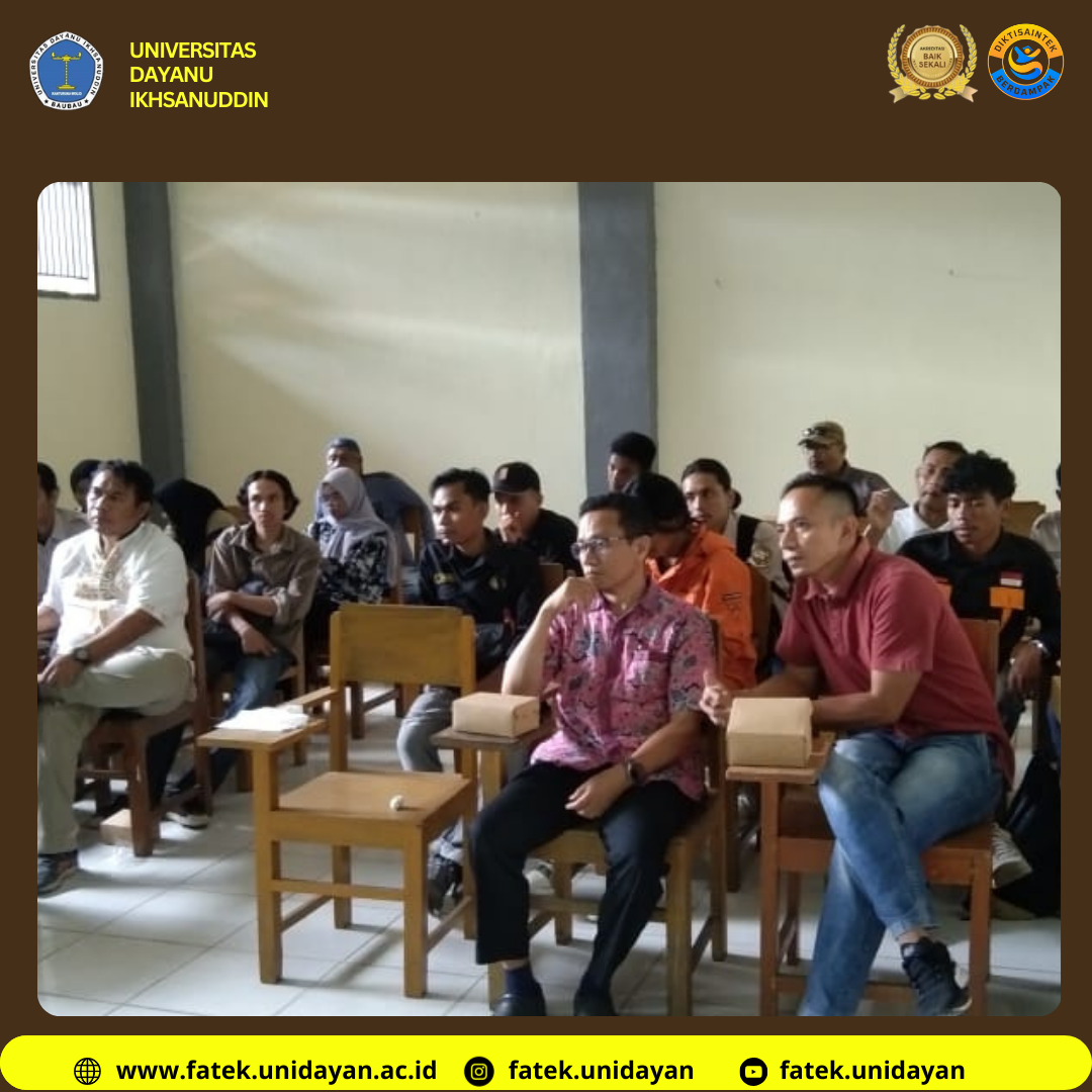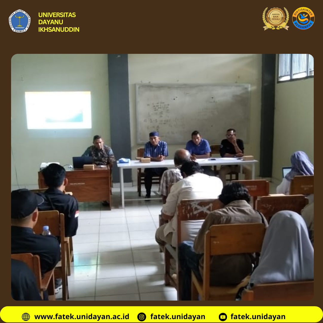 Baubau – Fakultas Teknik Universitas Dayanu Ikhsanuddin (UNIDAYAN) menggelar rapat koordinasi persiapan Pengenalan Kehidupan Kampus bagi Mahasiswa Baru (PKKMB) Tahun Akademik 2025/2026. Kegiatan yang dilaksanakan di ruang rapat Fakultas Teknik ini dihadiri oleh Wakil Rektor III Bidang Kemahasiswaan Bapak La Baride, S.T., M.T., jajaran pejabat fakultas, dosen, Pelaksana Jabatan Badan Eksekutif Mahasiswa (PJ. BEM) Fakultas Teknik, serta perwakilan dari masing-masing himpunan mahasiswa.