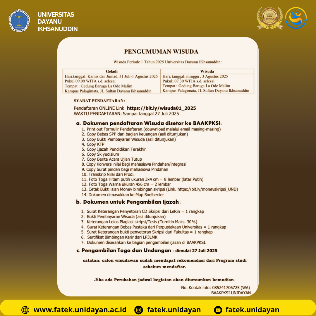 Halo, pejuang Teknik! ๐ง๐ฅ Setelah melewati ribuan jam di ruang kelas, laboratorium, bimbingan, seminar, hingga pertarungan panjang dengan skripsi dan proyek akhir, tibalah saatnya kita bersiap melangkah menuju panggung kebanggaan: Wisuda Periode I Tahun 2025 Universitas Dayanu Ikhsanuddin!