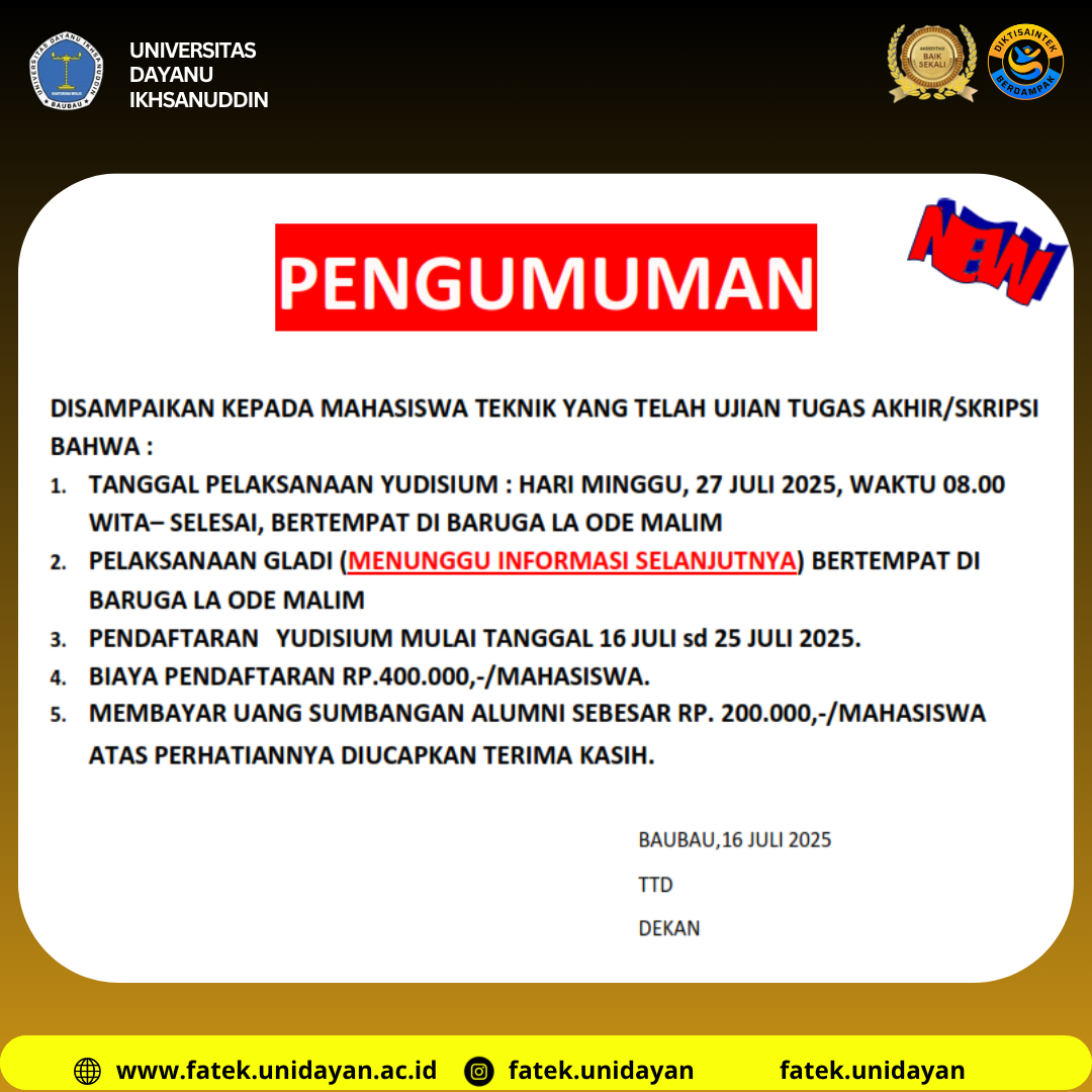 Fakultas Teknik Universitas Dayanu Ikhsanuddin (UNIDAYAN) kembali menggelar salah satu agenda penting dalam kalender akademik, yakni Yudisium bagi mahasiswa yang telah menyelesaikan seluruh rangkaian ujian tugas akhir atau skripsi. Dalam pengumuman resmi yang dikeluarkan oleh pihak fakultas pada tanggal 16 Juli 2025, disampaikan bahwa pelaksanaan yudisium akan berlangsung pada hari Minggu, 27 Juli 2025, mulai pukul 08.00 WITA hingga selesai, dan bertempat di Baruga La Ode Malim. Kegiatan ini merupakan momen puncak bagi mahasiswa tingkat akhir untuk secara resmi dinyatakan lulus dari jenjang pendidikan sarjana teknik setelah menempuh proses panjang, mulai dari perkuliahan, praktik laboratorium, proyek lapangan, hingga penyusunan tugas akhir yang penuh tantangan.