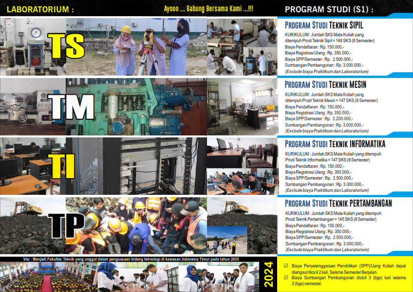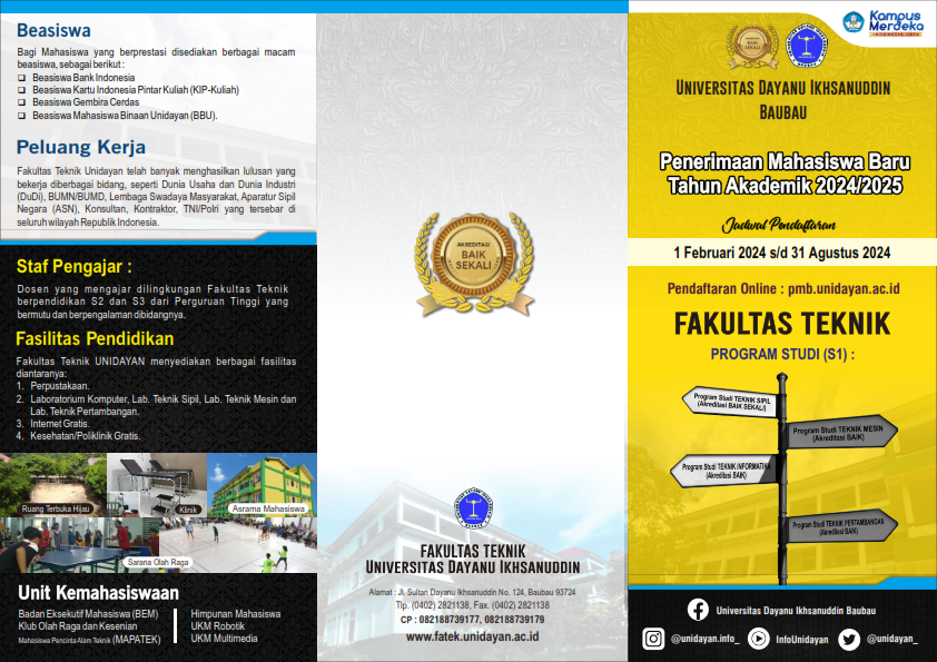 HAIII,,,,KAKAK, ADEK,,SAUDARA,,,setelah sekolah mau kuliah tapi bingung milih jurusan??? AYOOO ke unidayan baubau dan gabung bersama kamidi fakultas teknik. fakultas teknik unidayan memilik 4 jurusan yang sudah terakreditasi, yaitu : teknik sipil dengan akreditasi baik sekali, teknik mesin dengan akreditas baik, teknik informatika terakreditas baik dan teknik pertambangan juga terakreditasi baik. fakultas teknik juga memiliki laboratorium di masing-masing jurusan. untuk tenaga pengajar yang ada di fakultas teknik sudah berstandar lulusan s2 dan kompeten serta berkwalitas di bidang masing-masing.