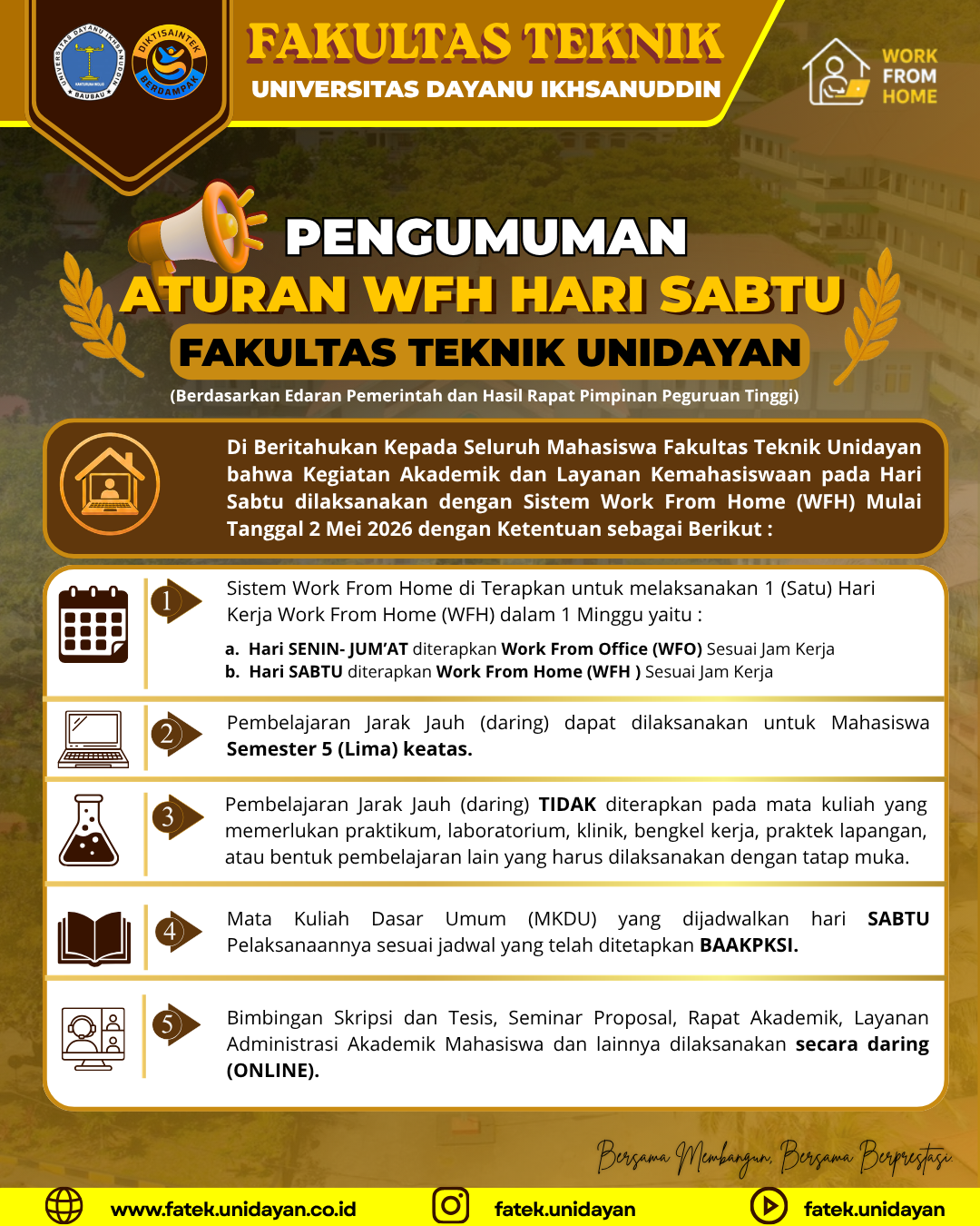 Penerapan sistem WFH ini didasarkan pada edaran pemerintah serta hasil rapat pimpinan perguruan tinggi yang mempertimbangkan efektivitas, efisiensi, dan fleksibilitas dalam pelaksanaan kegiatan akademik. Fakultas Teknik Unidayan berkomitmen untuk terus meningkatkan kualitas layanan pendidikan tanpa mengurangi mutu pembelajaran.