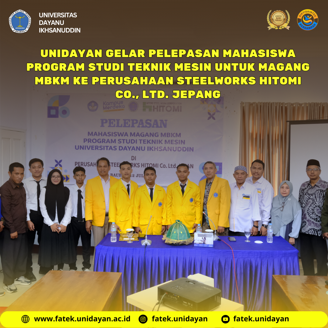 Universitas Dayanu Ikhsanuddin (Unidayan) melalui Fakultas Teknik secara resmi menggelar acara pelepasan mahasiswa Program Studi Teknik Mesin yang terpilih mengikuti program magang internasional dalam skema Merdeka Belajar Kampus Merdeka (MBKM). Program magang ini merupakan bagian dari upaya konkret kampus dalam membekali mahasiswa dengan pengalaman kerja nyata di industri global. Para mahasiswa akan menjalani masa magang di perusahaan terkemuka asal Jepang, Steelworks Hitomi Co., Ltd., yang berlokasi di negara dengan teknologi industri termaju di dunia. Pelepasan ini menjadi wujud komitmen Unidayan untuk terus mendorong lulusannya menjadi insan yang unggul, profesional, dan siap bersaing di tingkat internasional.