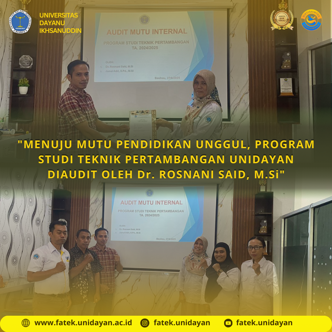 Baubau – Program Studi Teknik Pertambangan Fakultas Teknik Universitas Dayanu Ikhsanuddin (UNIDAYAN) resmi menjalani Audit Mutu Internal (AMI) Tahun 2025. Kegiatan ini dipimpin langsung oleh auditor utama, Dr. Rosnani Said, M.Si, bersama tim audit Bapak Jamal Adri, S.Pd., M.Pd., pada Rabu ( 27 Agustus 2025) di ruang Prodi Teknik Pertambangan.